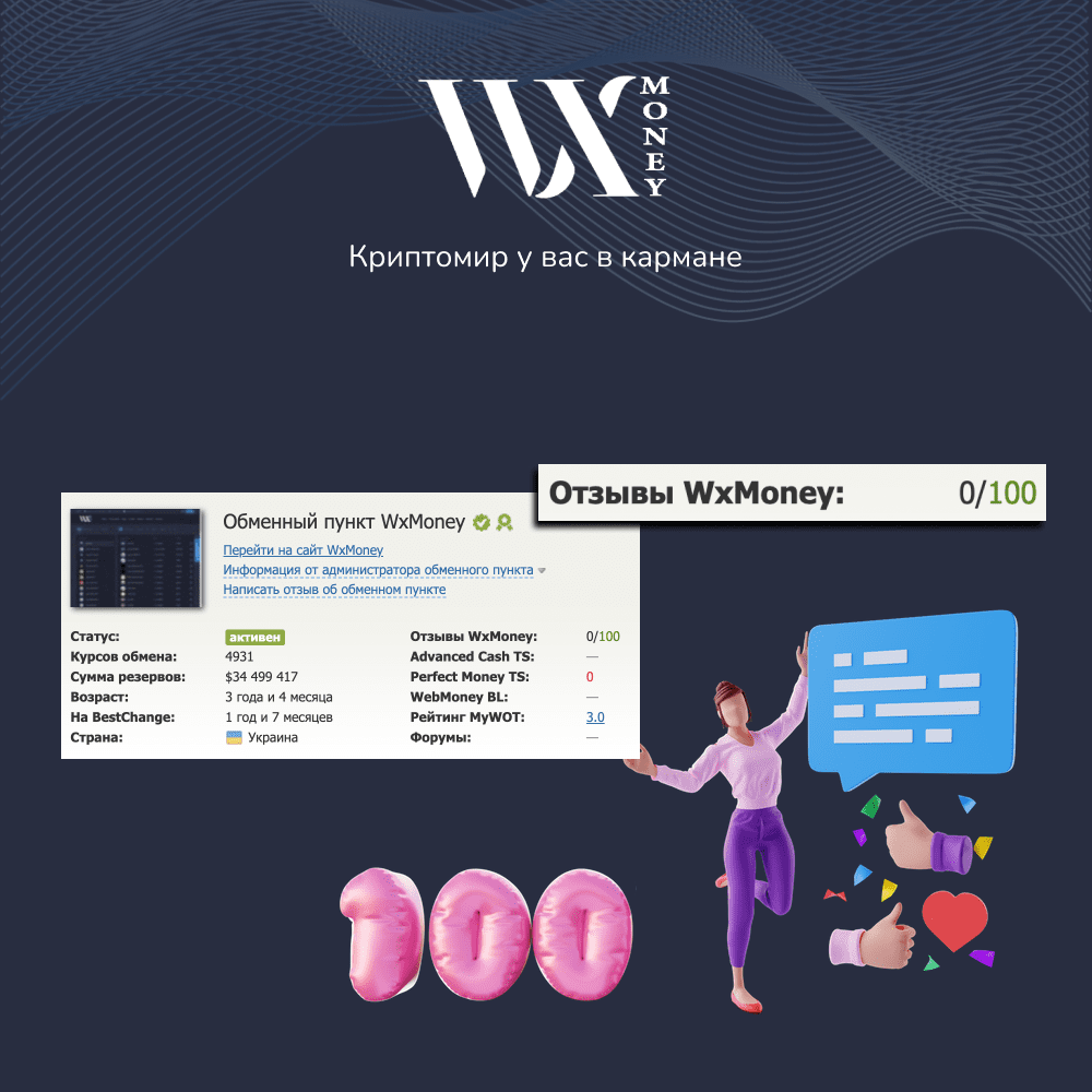 Команда WX.Money благодарит вас за вашу активную обратную связь! Прошел всего месяц с тех пор, как наш сервис добавили на BestChange, а у нас уже 100 отзывов. Мы будем и дальше стараться, чтобы вы всегда оставались довольны нашими услугами.